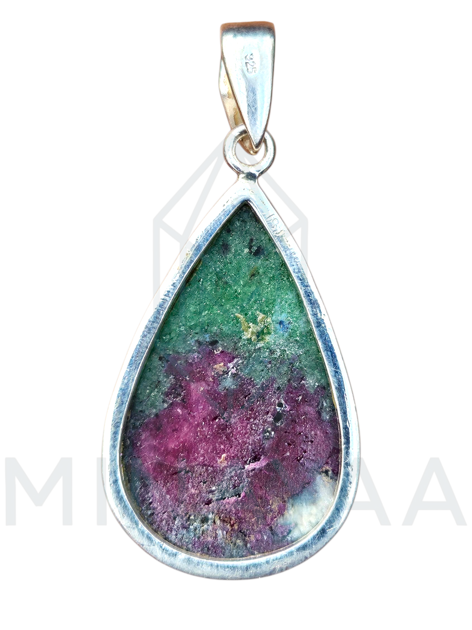 Cette gemme unique, également appelée Anyolite, se distingue par son mariage naturel de rouge vif et de vert profond. Montée sur argent 925, elle allie beauté naturelle et élégance artisanale. Le rubis zoisite se caractérise par :